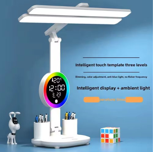 Eye protection LED desk lamp with time display, foldable horizontal touch control LED study reading desk lamp with clock, fan and pen holder